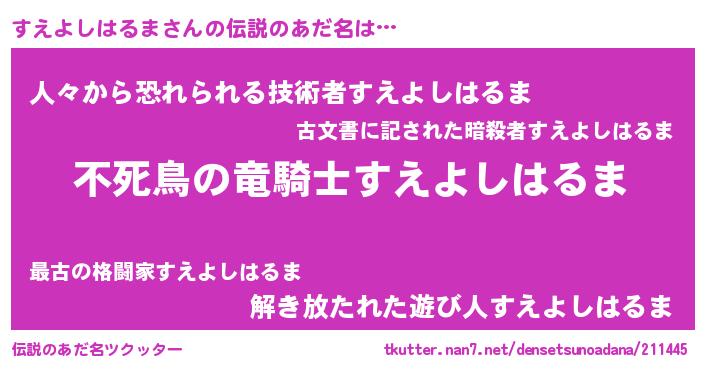 | 男性向けラノベタイトル風あだ名 | 『すえよしはるまに滅ぼされるだけの簡単なお仕事です』 |