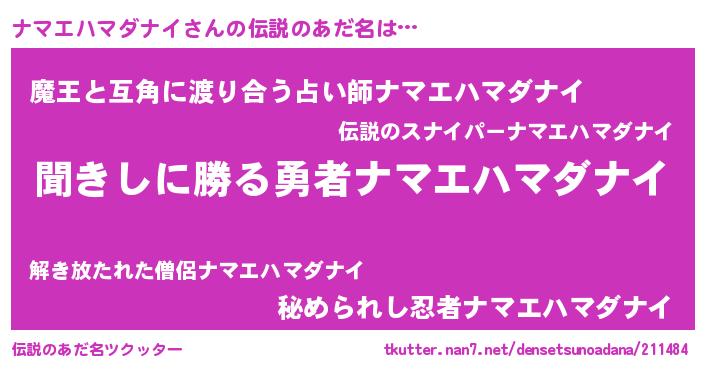 | ヒーロー風カッコイイあだ名 | 『仮面ナマダー』『ネオナマエハマダナイ』 |