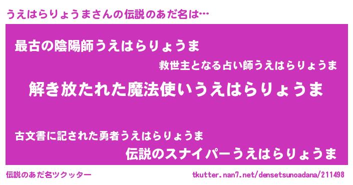 | 男性向けラノベタイトル風あだ名 | 『うえはらりょうまの嫁は女の子じゃないと思った?』 |