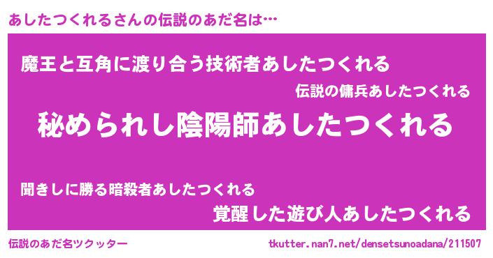| 男性向けラノベタイトル風あだ名 | 『アシタツクレルスレイヤー』 |
