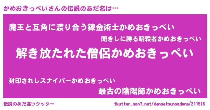 | 男性向けラノベタイトル風あだ名 | 『かめおきっぺいの嫁は女の子じゃないと思った?』 |