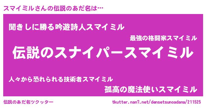 | 意味不明あだ名 | 『住所不定無職スマイミル(84歳)』 |