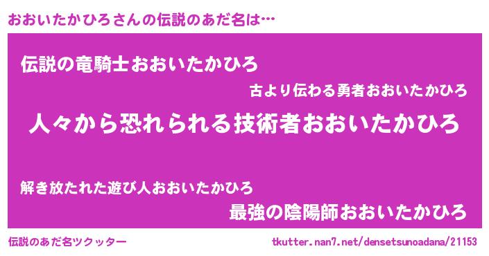 | 男性向けラノベタイトル風あだ名 | 『魔弾の王とおおいたかひろ』 |