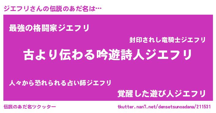 | 意味不明あだ名 | 『永久保存ジエフリ』『自称ジエフリ』 |