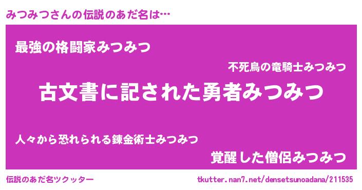 | 意味不明あだ名 | 『住所不定無職みつみつ(93歳)』 |