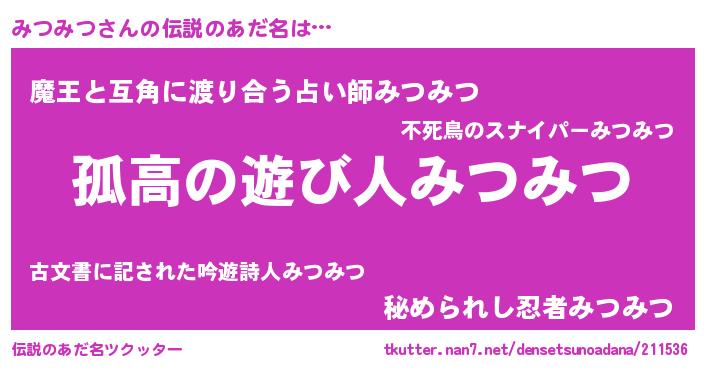 | ヒーロー風カッコイイあだ名 | 『暗黒騎士ミツ』『天空の使者みつみつ』 |