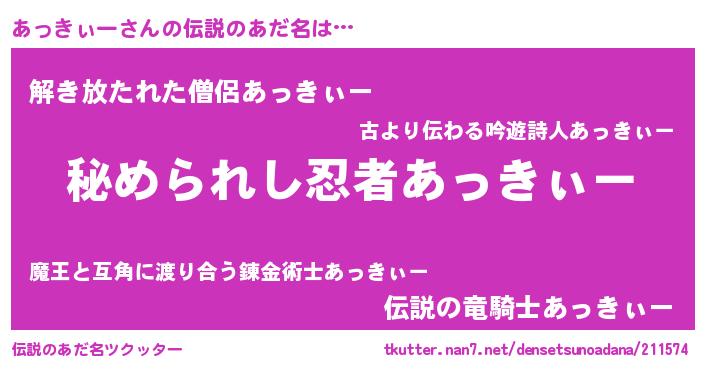 | ファンタジー風あだ名 | 『ゼアットゥ』『エターナルアッキィーー』 |