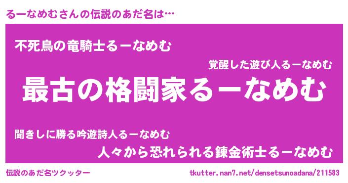 | 男性向けラノベタイトル風あだ名 | 『この素晴らしい世界にるーなめむを!』 |