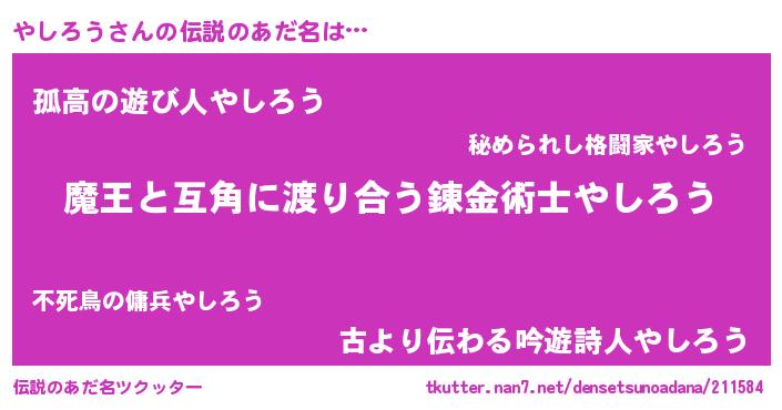 | ヒーロー風カッコイイあだ名 | 『友情の使者やしろう』『黄金騎士ヤシ』 |