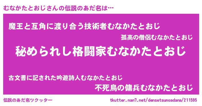 | 男性向けラノベタイトル風あだ名 | 『魔弾の王とむなかたとおじ』 |