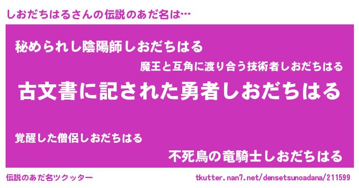 | 男性向けラノベタイトル風あだ名 | 『誰もが恐れるあのしおだちはるが、ぼくの専属メイドになるようです。』 |