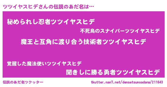 | ヒーロー風カッコイイあだ名 | 『仮面ツツダー』『ネオツツイヤスヒデ』 |