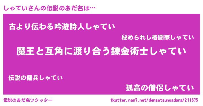 | ヒーロー風カッコイイあだ名 | 『愛の使者しゃてい』『ネオシャテイ』 |