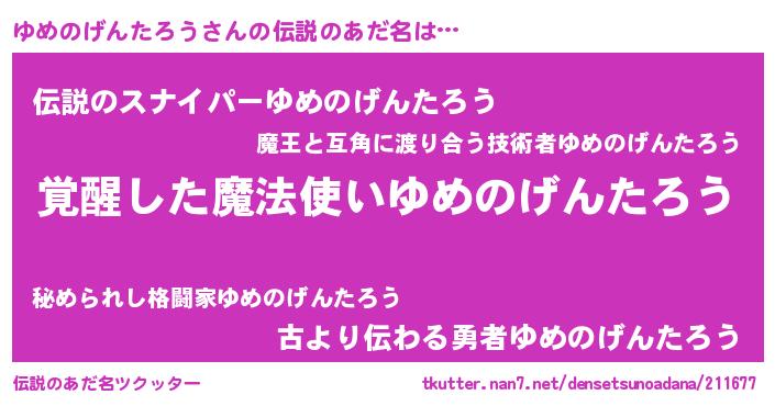 | 男性向けラノベタイトル風あだ名 | 『ゆめのげんたろうの嫁は女の子じゃないと思った?』 |
