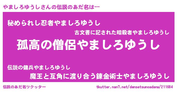 | 男性向けラノベタイトル風あだ名 | 『魔弾の王とやましろゆうし』 |