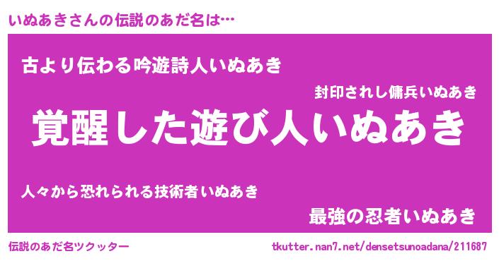 | 男性向けラノベタイトル風あだ名 | 『Re:いぬあきから始める異世界生活』 |