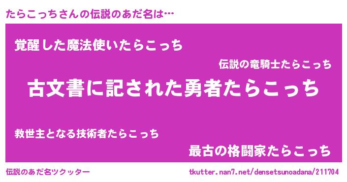 | 意味不明あだ名 | 『永久保存たらこっち』『自称たらこっち』 |