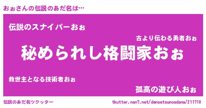 | ヒーロー風カッコイイあだ名 | 『仮面オォダー』『ウルトラおぉマン』 |