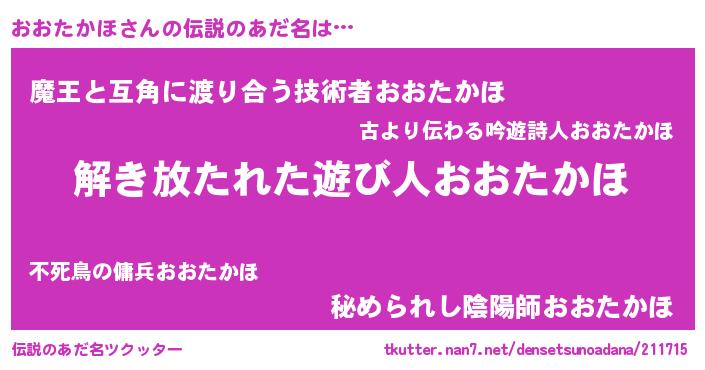| 女子向けラノベタイトル風あだ名 | 『おおたかほの卵を拾いまして』 |