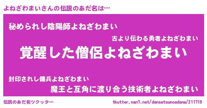 | 男性向けラノベタイトル風あだ名 | 『この素晴らしい世界によねざわまいを!』 |