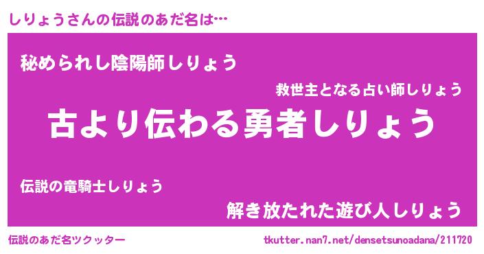 | ヒーロー風カッコイイあだ名 | 『最強戦士シリョウ』『仮面シリダー』 |