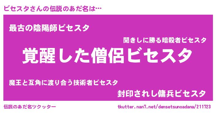 | 男性向けラノベタイトル風あだ名 | 『ビセスタの嫁は女の子じゃないと思った?』 |