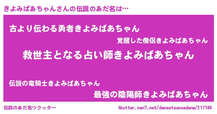 | 男性向けラノベタイトル風あだ名 | 『ノーゲーム・ノーキヨミバアチャン』 |