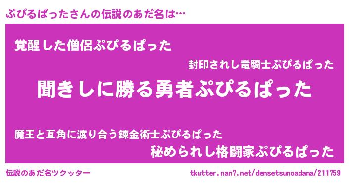 | 男性向けラノベタイトル風あだ名 | 『ぷぴるぱったという概念が存在しない退屈な世界 』 |