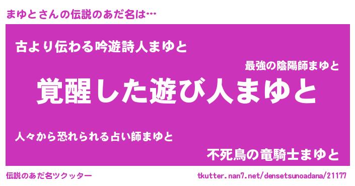 | 意味不明あだ名 | 『とにかく怪しいまゆと』『自称まゆと』 |