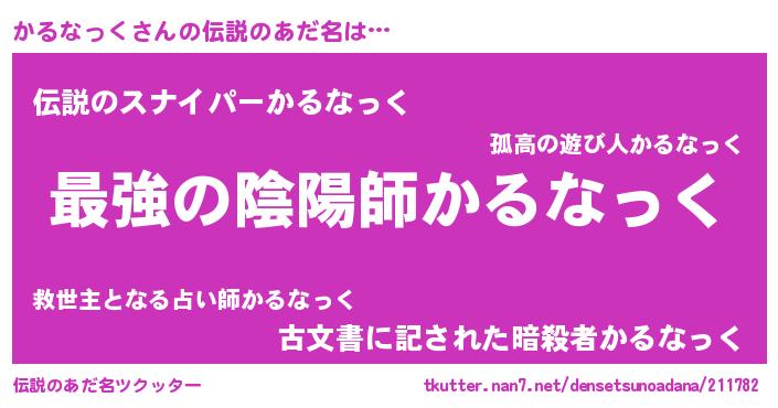 | 男性向けラノベタイトル風あだ名 | 『うちのかるなっくが世界を掌握している!』 |