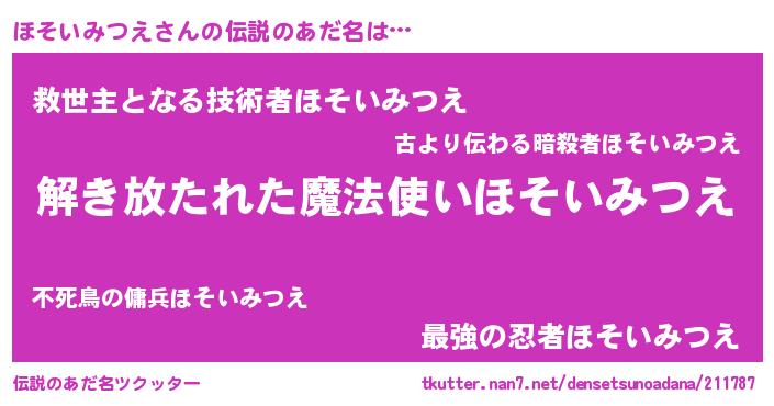| 胡散臭い通販商品みたいなあだ名 | 『世界中を虜にした100年もののヴィンテージワイン…その名も「ほそいみつえ」』 |