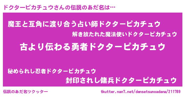 | ヘコむあだ名 | 『ドクターピカチュウ(震え声)』『なまこ酢』 |