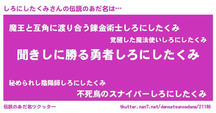 | 胡散臭い通販商品みたいなあだ名 | 『絶対に幸福をもたらす水素水…その名も「しろにしたくみ」』 |