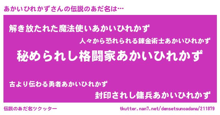 | 男性向けラノベタイトル風あだ名 | 『アカイヒレカズスレイヤー』 |