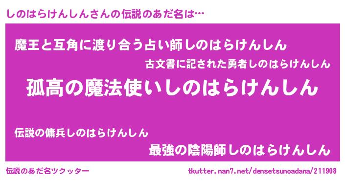 | 胡散臭い通販商品みたいなあだ名 | 『信頼と実績のサプリメント…その名も「しのはらけんしん」』 |