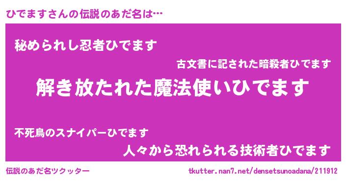 | 女子向けラノベタイトル風あだ名 | 『ひでますの卵を拾いまして』 |