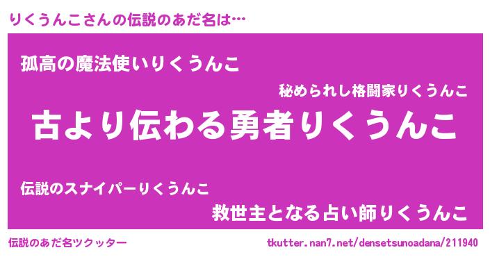 | 男性向けラノベタイトル風あだ名 | 『りくうんこという概念が存在しない退屈な世界 』 |