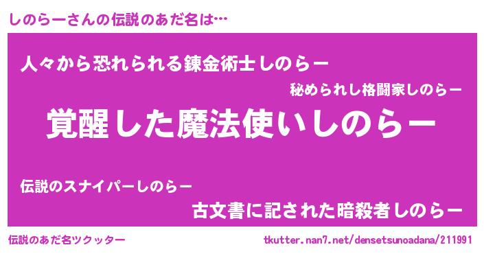 | ヒーロー風カッコイイあだ名 | 『炎刃騎士シノ』『正義の使者しのらー』 |