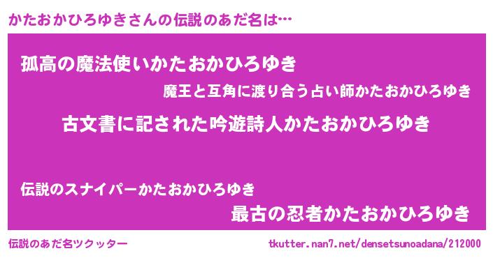 | 男性向けラノベタイトル風あだ名 | 『かたおかひろゆきに滅ぼされるだけの簡単なお仕事です』 |