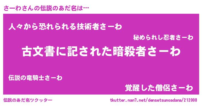 | ヒーロー風カッコイイあだ名 | 『ネオサーワ』『正義の使者さーわ』 |