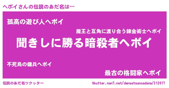 | 男性向けラノベタイトル風あだ名 | 『ヘボイという概念が存在しない退屈な世界 』 |
