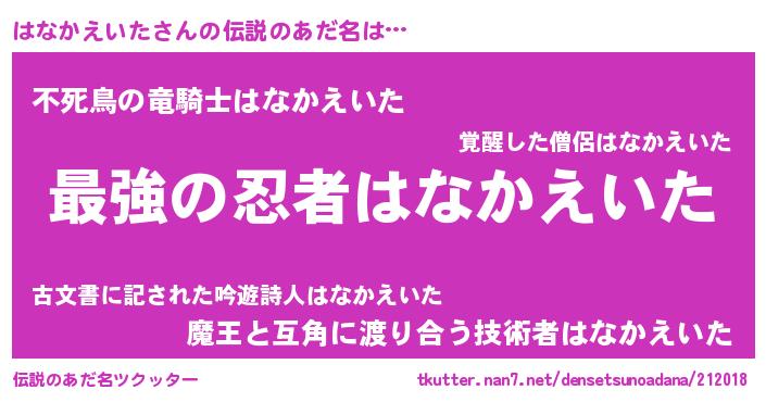 | 胡散臭い通販商品みたいなあだ名 | 『あなたにだけ特別に提供する限定10本のレアな日本酒…その名も「はなかえいた」』 |
