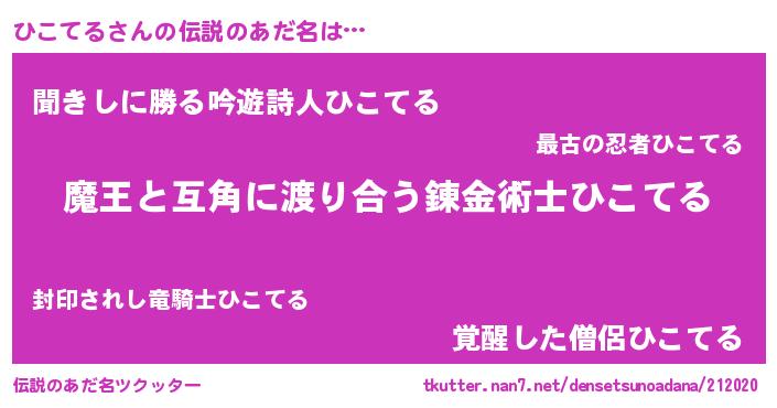 | ヒーロー風カッコイイあだ名 | 『慈愛の使者ひこてる』『ネオヒコテル』 |