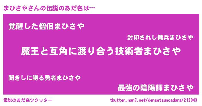 | ヒーロー風カッコイイあだ名 | 『ウルトラ戦士マヒサヤ』『幻影騎士マヒ』 |
