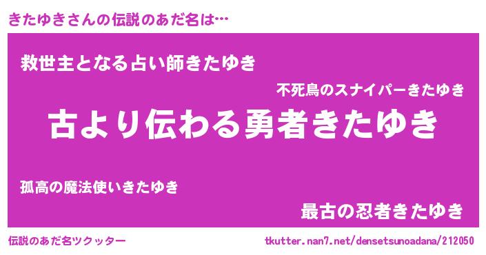 | 男性向けラノベタイトル風あだ名 | 『魔弾の王ときたゆき』『緋弾のキタユキ』 |