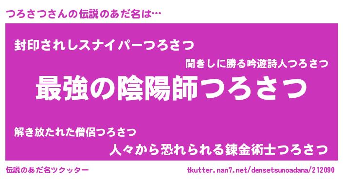 | 男性向けラノベタイトル風あだ名 | 『つろさつ~年齢イコール彼女いない歴の魔法使い~』 |