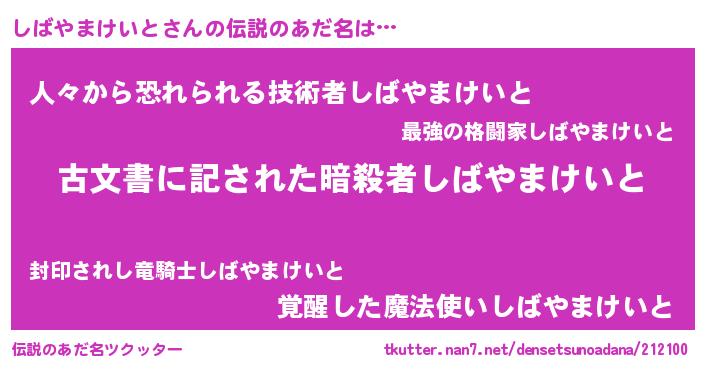 | 男性向けラノベタイトル風あだ名 | 『Re:しばやまけいとから始める異世界生活』 |