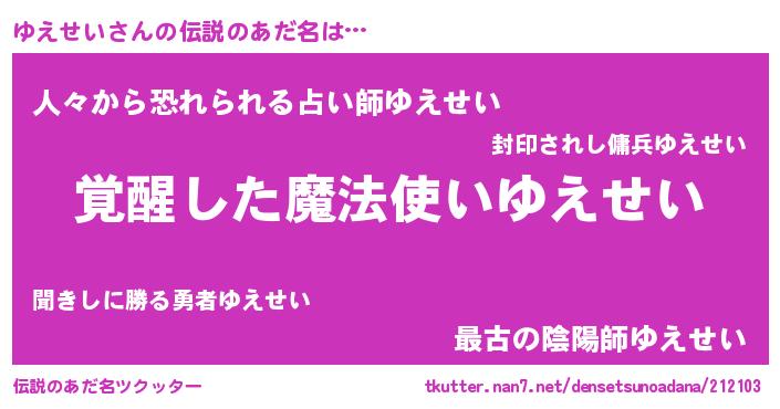 | ヒーロー風カッコイイあだ名 | 『天弓騎士ユエ』『天空の使者ゆえせい』 |