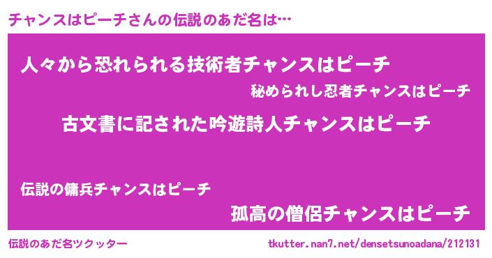| 男性向けラノベタイトル風あだ名 | 『チャンスはピーチに滅ぼされるだけの簡単なお仕事です』 |