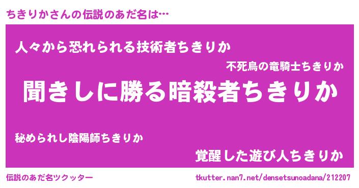 | 女子向けラノベタイトル風あだ名 | 『異世界で失敗しない100のちきりか』 |